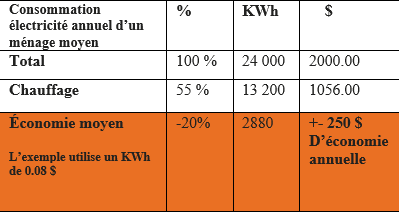 L'example ci-haut est pour un système 100 % électrique. Pour la même maison type, avec un système bi énergie au mazout, on peut facilement sauver 50 % du coût de chauffage de la maison (litre de mazout a 1.63$. (le 2023-10-25)). Par le fait même, vous devez moins souvent remplir le réservoir d’huile et faire l’entretien de la fournaise